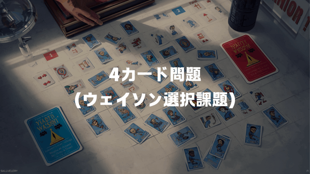 4カード問題(ウェイソン選択課題)というものをご存知でしょうか。 4枚のカードの表裏がどうなっているのかを確かめるという問題であり、よく考えれば簡単に分かる内容なのですが、なぜか間違えてしまう人が多いことで有名な問題です。 今回はそんな4カード... -