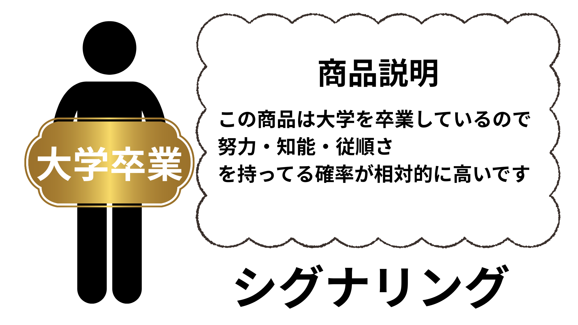 企業が採用において、「この人は優秀か?」を知る手がかりとして学歴を使うので、学歴は優秀さを表すシグナリングになります。
