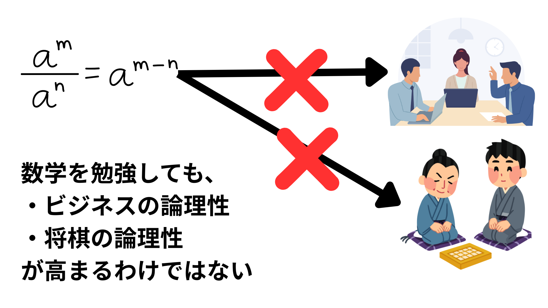 数学で鍛えられるのは、証明問題や方程式を解くための論理性であり、数学を勉強して将棋が上手くなるわけではないのです。